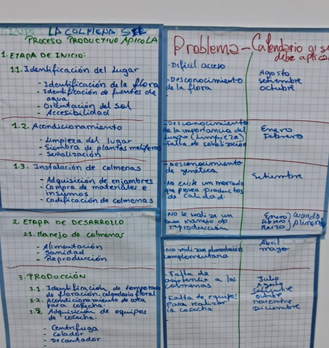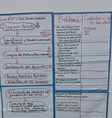 During the working session, a flowchart of the beekeeping production process was presented, accompanied by an analysis of the problems at each stage: from the identification and preparation of the land to the honey harvest. Limitations were highlighted, such as technical ignorance about honey-producing flora, poor apiary planning, inappropriate use of materials, insufficient technical assistance, and lack of equipment to ensure a high-quality and safe harvest. These factors, combined with limited commercial coordination and low technology adoption, restrict the competitive growth of the sector.