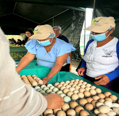 Figura 4. Las productoras del APA Tierra del Inca mostrando su producción de huevos y el modo de presentación en tapas de plástico para garantizar la limpieza y desinfección
