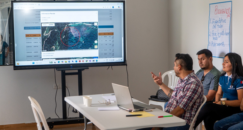 Figure 11. Presentation by the specialist in the integrated traceability system used by the Aprocassi cooperative, on a digital platform that allows the customer to access information on each producer, from their coffee production system under the SAF scheme, through to their risk analysis, collection, and final destination.