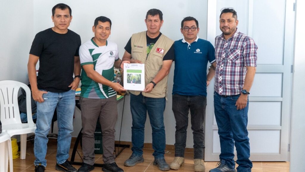 Figure 13. Handover to the manager of the Aprocassi Cooperative of the guide on the monitoring and surveillance system for farms under the EUDR, prepared by Practical Action consultant Jhoseari Fernández as part of the Andes Amazónico-BLF project