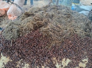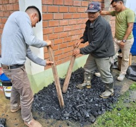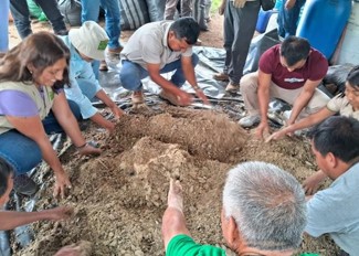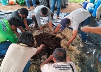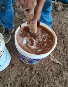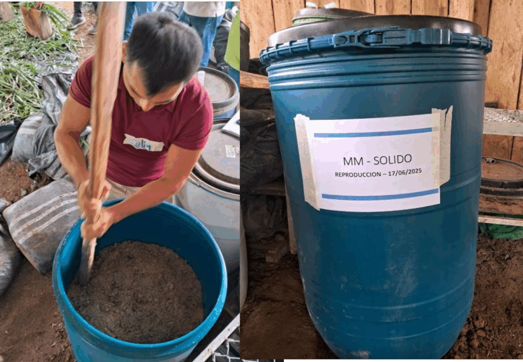 Preparación de Captura y reproducción de microorganismos de montaña sólido. Usando diferentes materiales orgánicos como el molido de la cascarilla del arroz, como fuente de carbono, carbohidratos que sirve como alimento y sustrato, la melaza como fuente de energía para los seres vivos de los microorganismos, estos materiales orgánicos se tiene en el paisaje señalando algunas otras alternativas como el molido de plátano, maíz, yuca entre otros como fuente de carbohidratos y alimentos, la chicha de jora como fuente de energía. Seguidamente se realizó la homogenización de las mezclas hasta que tenga la humedad adecuada (con un puño se agarró una muestra hasta que se forme una estructura sólida y/o exprimir y que caiga una gota), luego se coloca en un envase (bidón de 200 litros) donde se apisona para evitar cavidades de aire, cerrando herméticamente durante 30 días, para tener listo la propagación de los microorganismos que usaremos para las diferentes preparaciones.