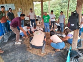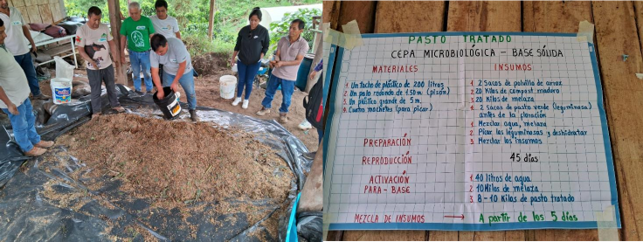 Dentro de ellas el uso del pasto verde, como las leguminosas, utilizado como fuente de nitrógeno y más aún como una cepa microbiológica de base sólida. En el desarrollo del taller de dos días se enseñó más de 10 estrategias: Preparación de captura y reproducción de microorganismos de montaña sólido; preparación de reproducción de pasto tratado; preparación bio – M4C; preparación del lixiviado del raquis de plátano; elaboración de abono solido fermentado Tipo/ bocashi; elaboración de bio repelente; elaboración de controlador biológico: preparación Bio shima – bioestimulante; preparación de te de bocashi; preparación de enraizado como parte de las estrategias de la innovación agroecológica para fortalecer los servicios ecosistémicos en los SAF de los cafetales, cacaotales y plataneros.